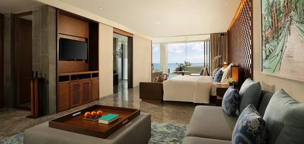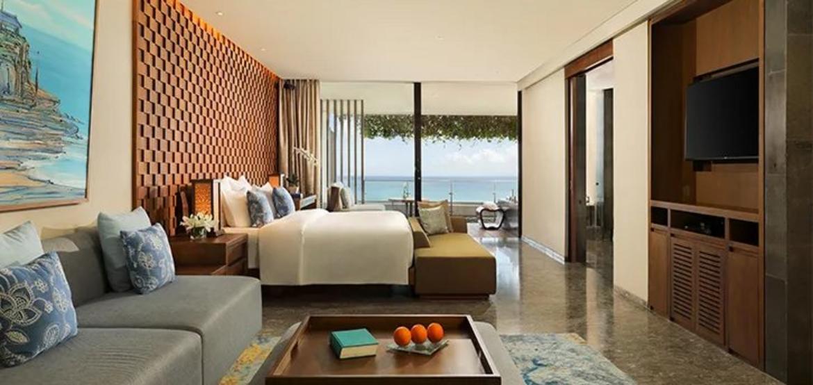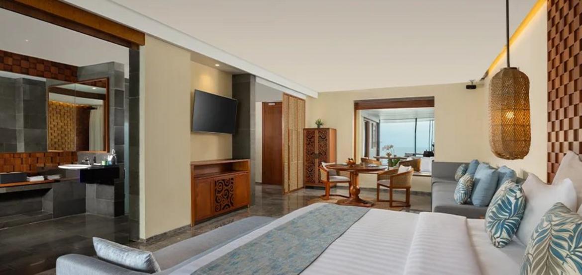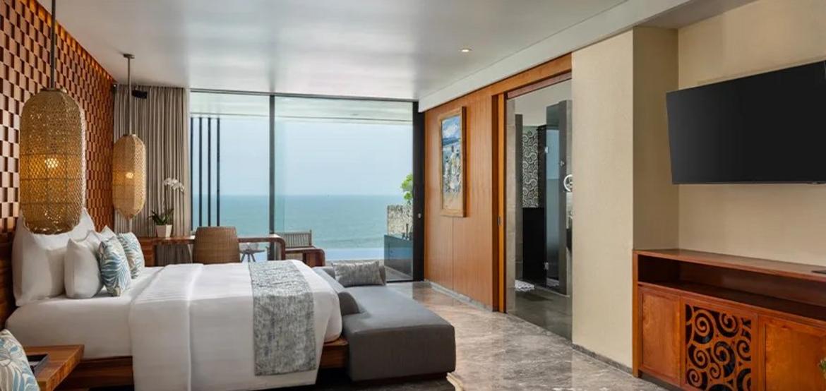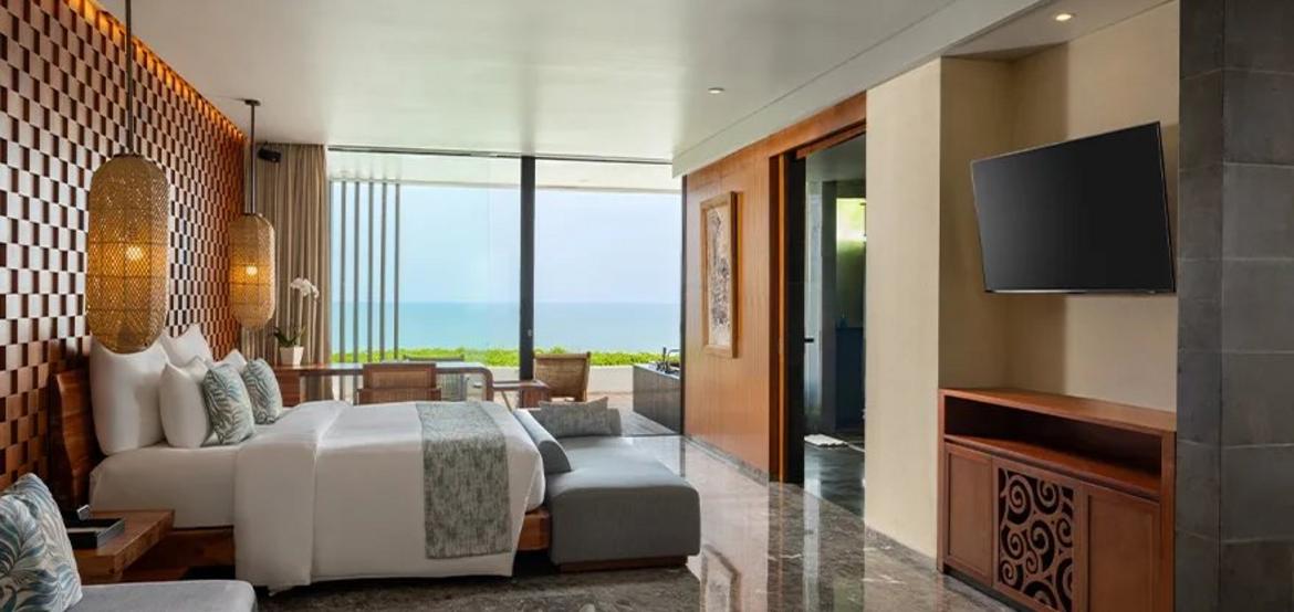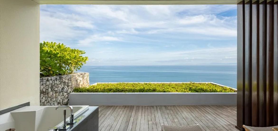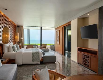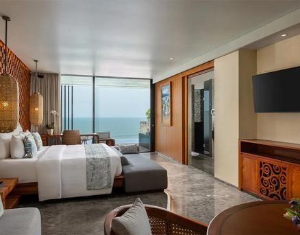 Nahe am Klippenrand gelegen, bieten die Ocean Front Suiten einen ununterbrochenen Panoramablick über den Indischen Ozean und den terrassierten Resort-Pool darunter. Bodentiefe Fenster fluten die Räume mit natürlichem Licht und rahmen das atemberaubende Meerespanorama. Mit ihrem modernen, tropischen Design und der ursprünglichen Schönheit der balinesischen Küste verbinden diese Suiten authentisches Inselfeeling mit edlem Komfort und Stil.