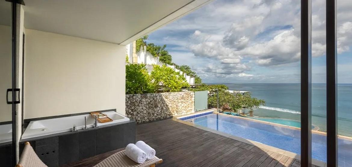Die Ocean Front Pool Suites verbinden den Luxus eines privaten Pools mit der spektakulären Schönheit der Klippenlage. Hoch über dem terrassierten Resort-Pool gelegen, bieten diese Suiten einen ununterbrochenen Blick auf den Indischen Ozean – mit Sonnenuntergängen, die den Horizont in unvergessliche Farben tauchen. Genieße fließendes Indoor-Outdoor-Living, entspanne oder speise auf deinem privaten Deck und lass dich von der balinesischen Sonne in absolutem Komfort verwöhnen.