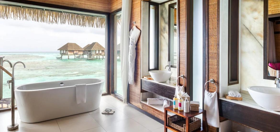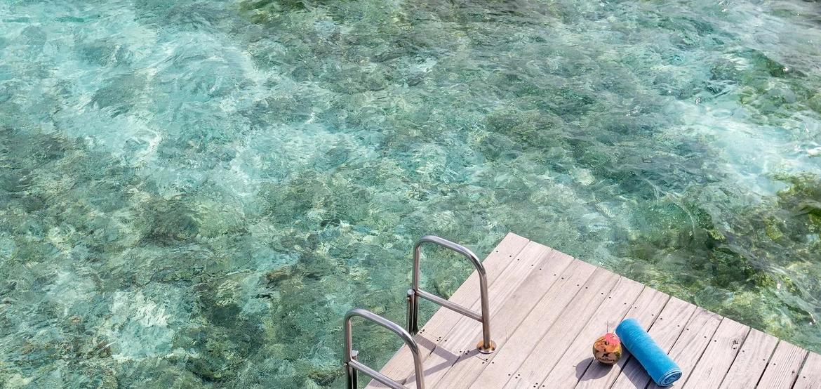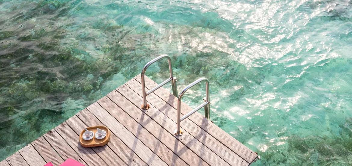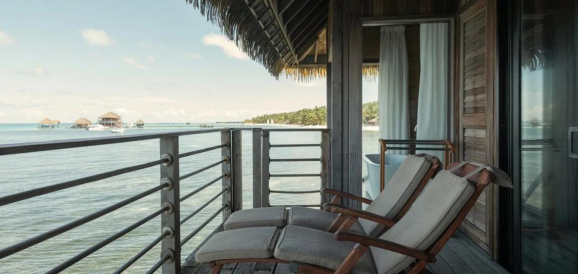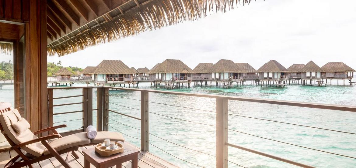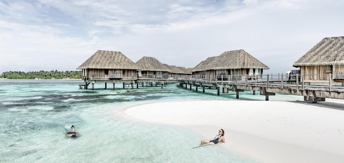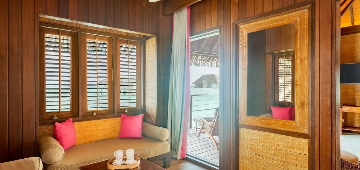 Der Zugang zu den Overwater-Suiten des Luxury Space erfolgt über Stege, die aus der Vogelperspektive die Form einer Palme bilden. Diese Suite mit einem Schlafzimmer verfügt über einen separaten Wohnbereich. Teakholzmöbel und ein fantastischer Panoramablick auf die Lagune von der Terrasse sowie ein privater Zugang zum Meer runden das Erlebnis ab. Kann nicht mit anderen Zimmerkategorien kombiniert werden. Kombinierbar nur mit derselben Kategorie und der Over Water Family Suite. Aus Sicherheitsgründen sind Kinder unter 8 Jahren in diesen Bungalows nicht erlaubt.