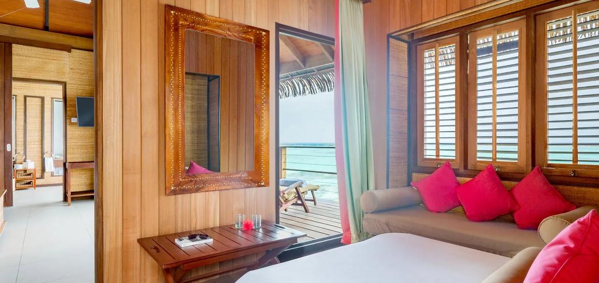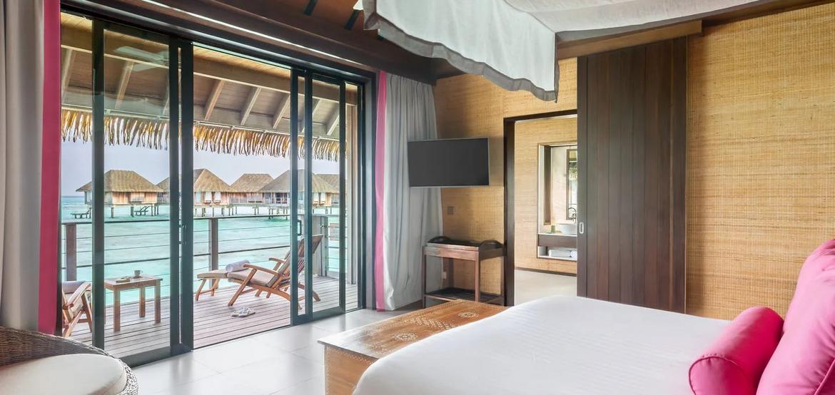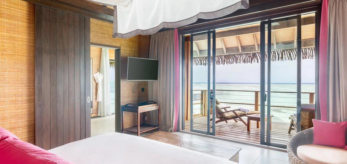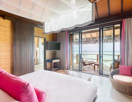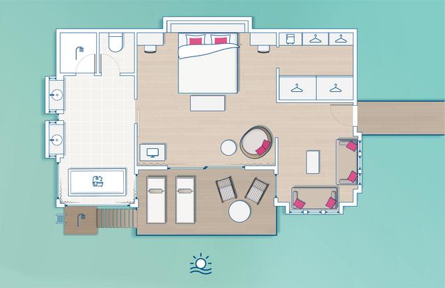 Der Zugang zu den 5T-Luxus-Overwater-Suiten erfolgt über Stege, die aus der Vogelperspektive die Form einer Palme bilden. Diese Suite mit einem Schlafzimmer verfügt über einen separaten Wohnbereich. Teakholzmöbel und ein fantastischer Blick auf die Lagune von der Terrasse sowie ein privater Zugang zum Meer runden das Erlebnis ab. Kann nicht mit anderen Zimmerkategorien kombiniert werden, nur mit Over Water Family Suite Panoramic View und Over Water Family Suite. Aus Sicherheitsgründen sind Kinder unter 8 Jahren in diesen Bungalows nicht erlaubt.