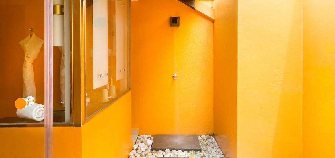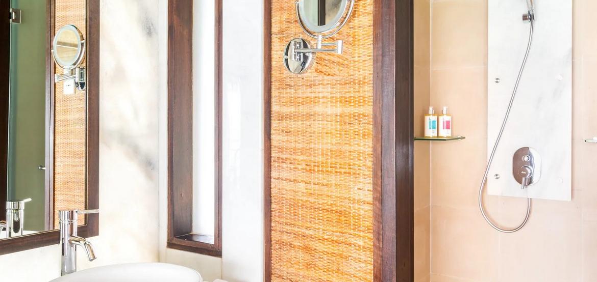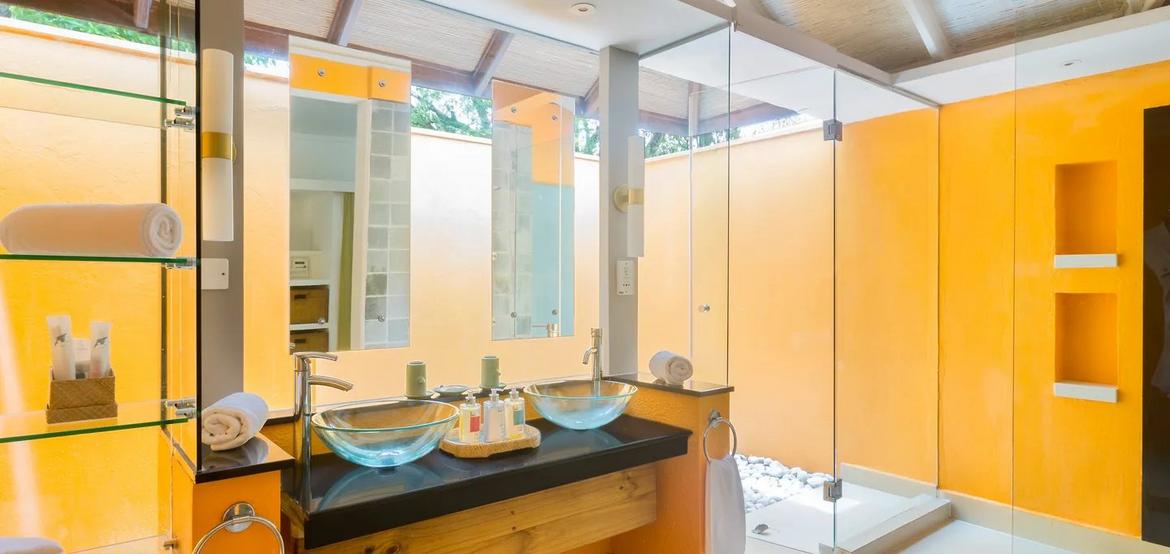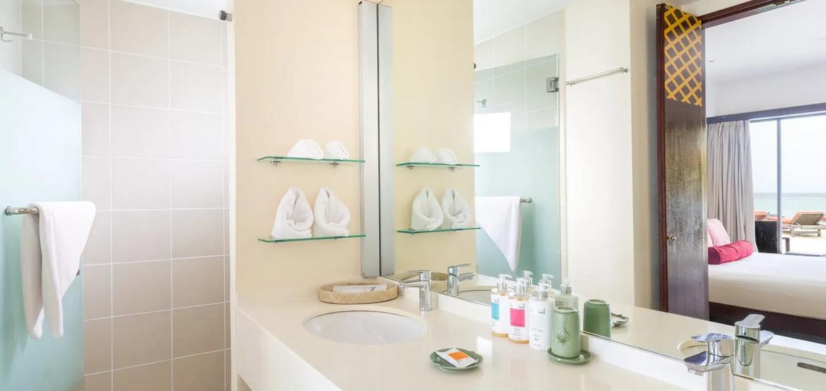 Die Deluxe-Zimmer mit Meerblick befinden sich im Erdgeschoss direkt am Strand. Die Bungalows verfügen über einen Eingangsbereich mit Ankleide und Schränken. Von hier aus gelangt man mit einer Stufe ins Badezimmer mit Waschbecken und einem Open-Air-Duschbereich. Es gibt keine Tür zwischen Flur und Badezimmer. Die Terrasse ist mit einem Tisch und Sonnenliegen ausgestattet. Kann nur mit derselben Zimmerkategorie kombiniert werden.