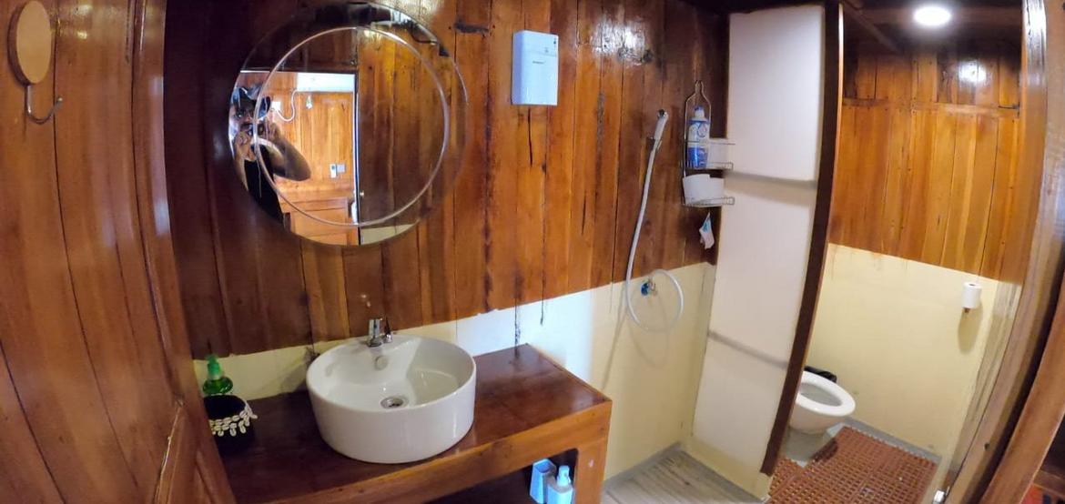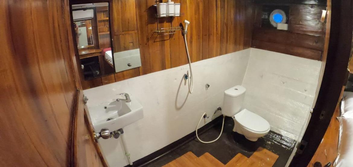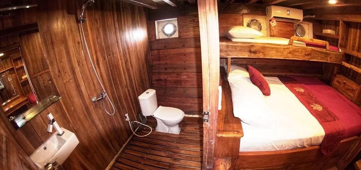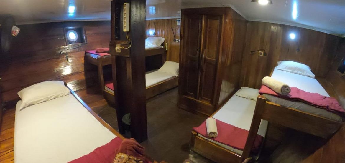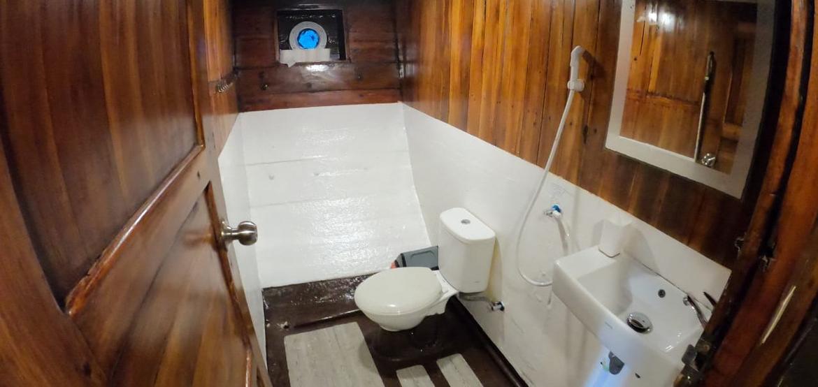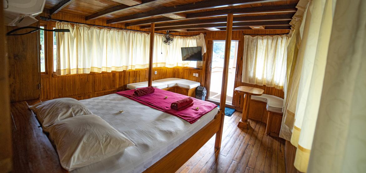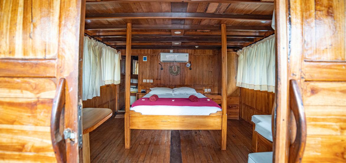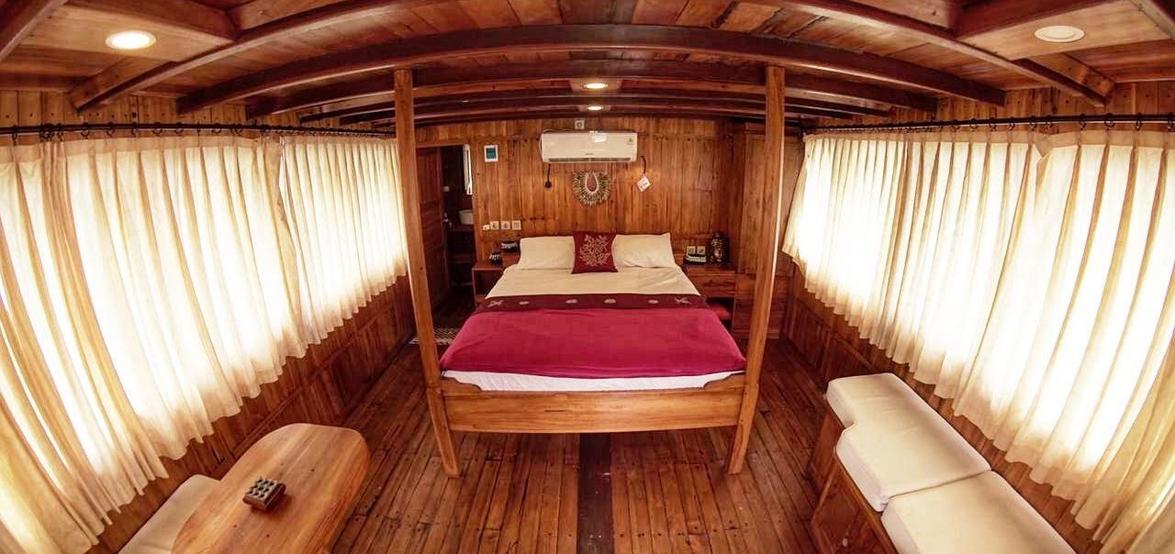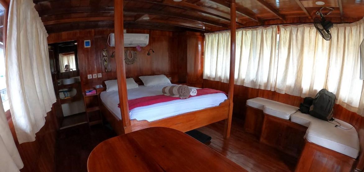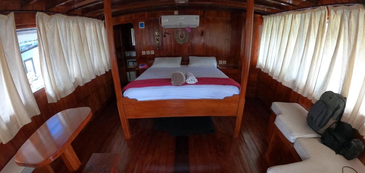 Jedes der 5 Zimmer an Bord ist groß genug, um eine eigene Sitzecke und 180-Grad-Blick über den Ozean zu bieten. 3 dieser Zimmer verfügen über ein eigenes Bad mit einer Dusche, die groß genug ist, um bequem einzutreten – anders als bei vielen anderen Chartern, bei denen man sich in den engen Bootseinrichtungen zurechtbiegen muss. Alle Bereiche sind mit wunderschön polierten Holzböden, Wänden und Decken ausgestattet, was wirklich das authentische indonesische Flair vermittelt.