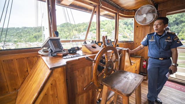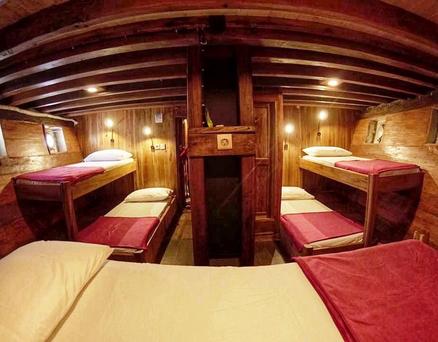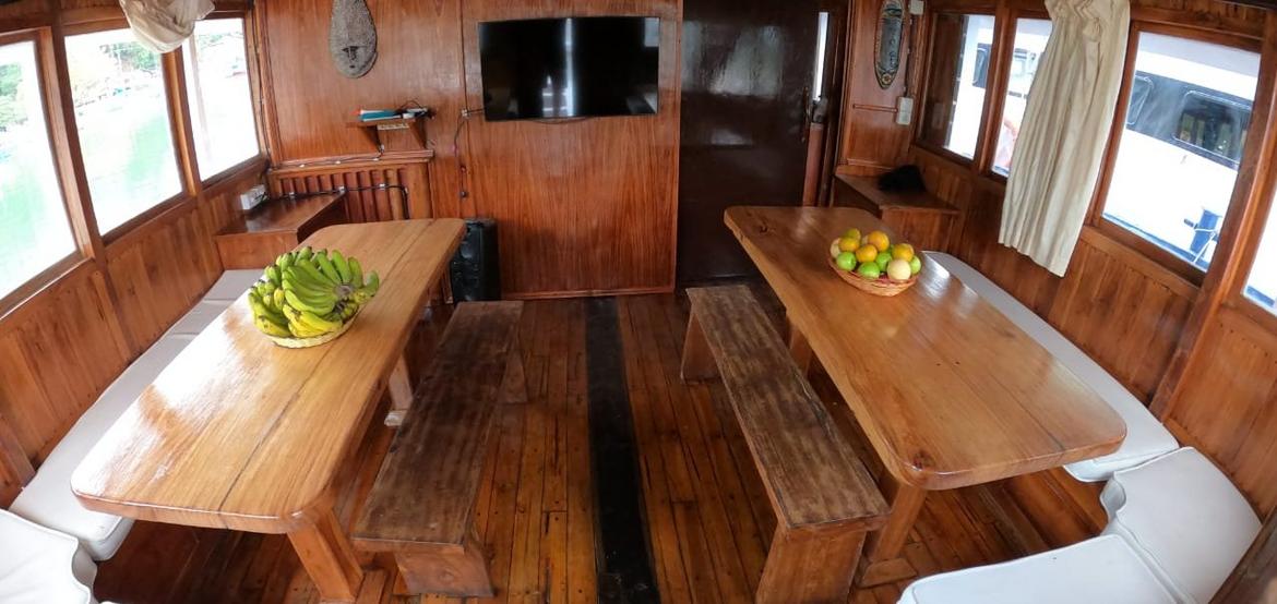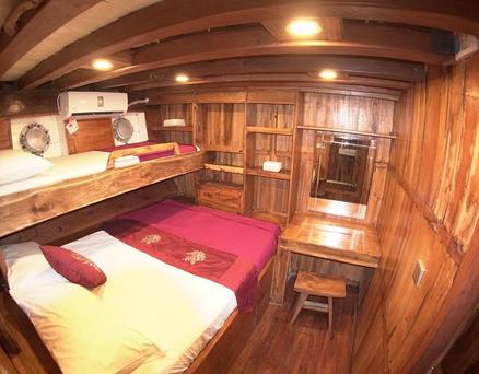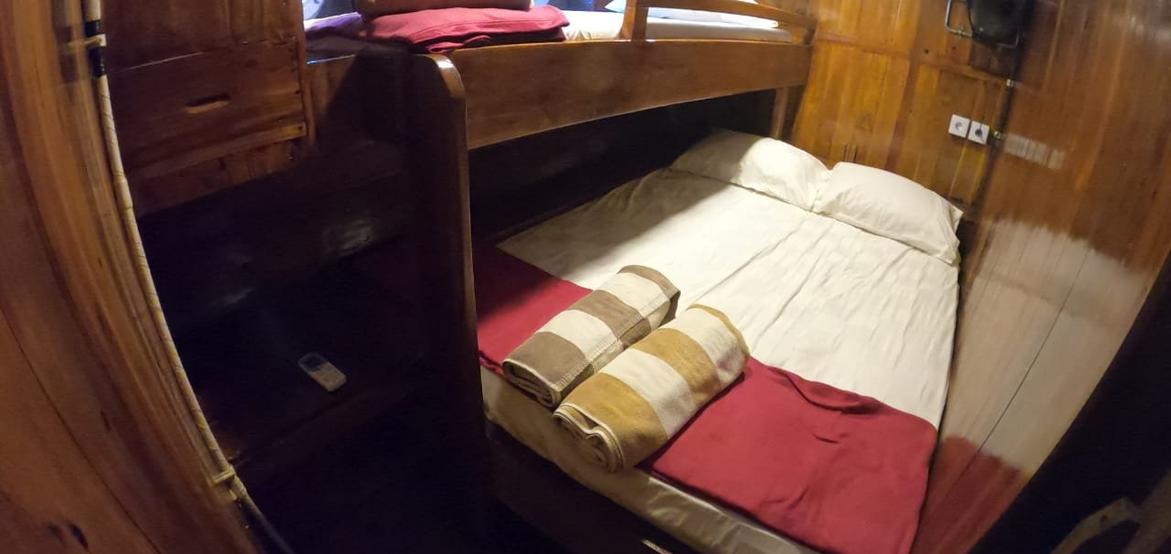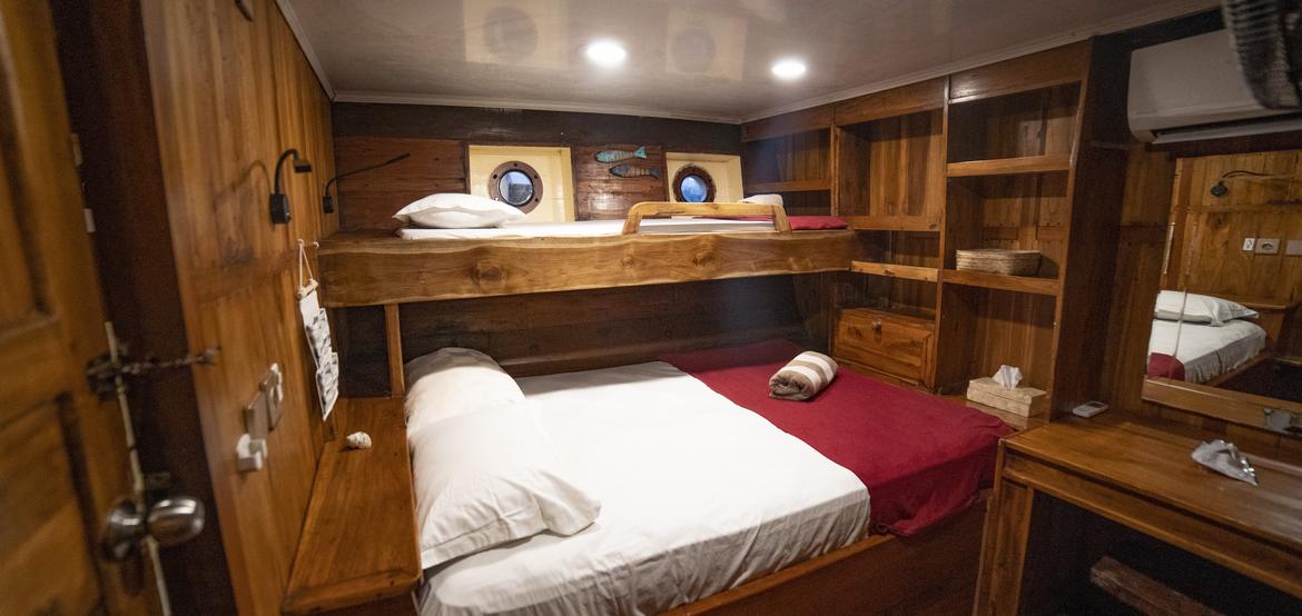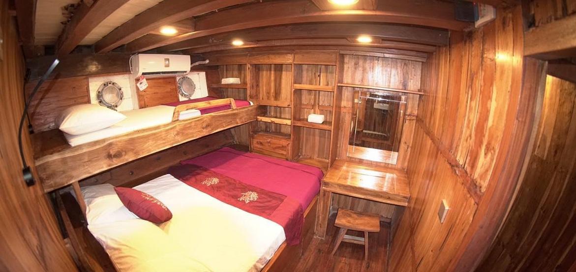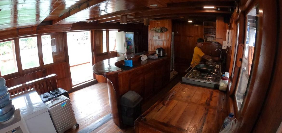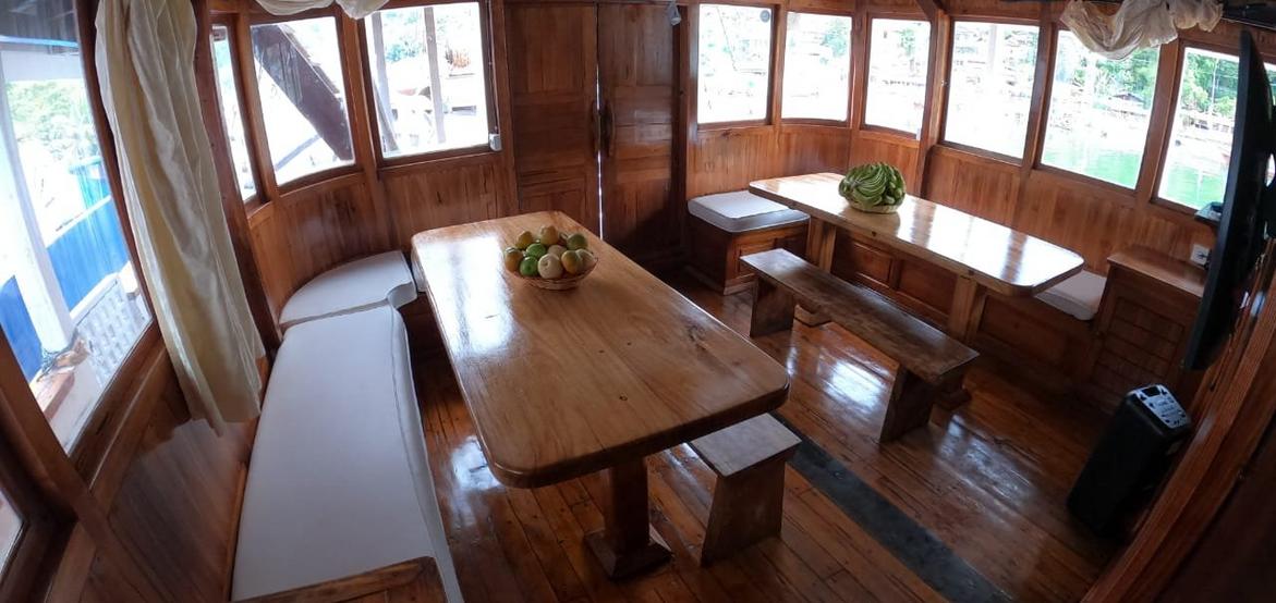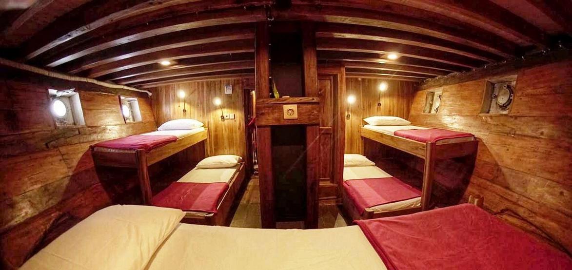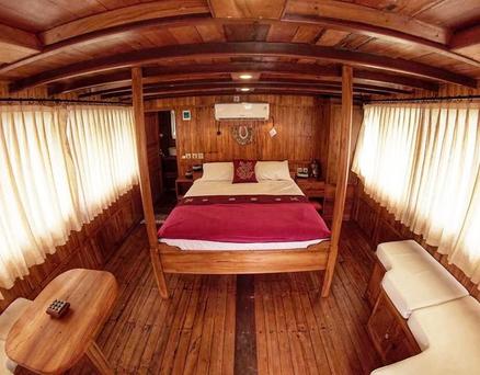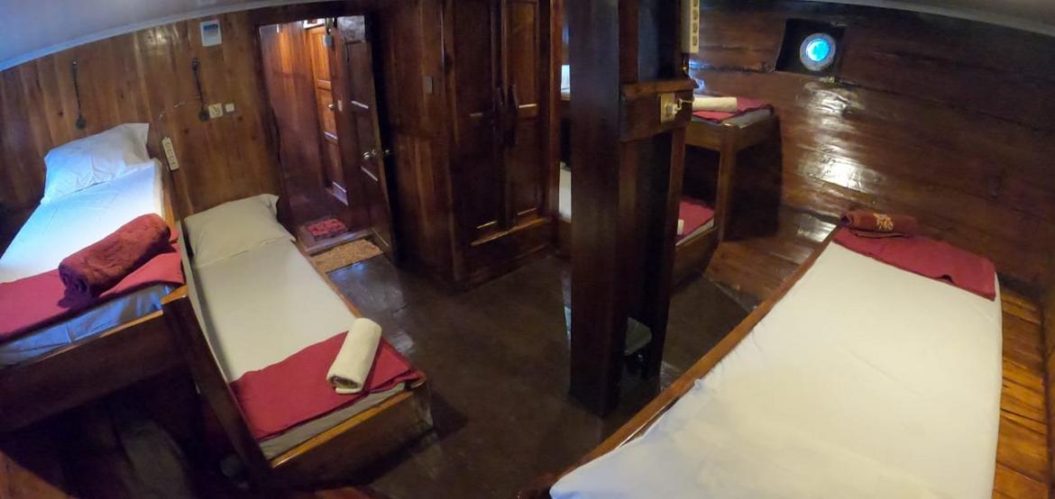 Jedes der 5 Zimmer an Bord ist groß genug, um eine eigene Sitzecke und 180-Grad-Blick über den Ozean zu bieten. 3 dieser Zimmer verfügen über ein eigenes Bad mit einer Dusche, die groß genug ist, um bequem einzutreten – anders als bei vielen anderen Chartern, bei denen man sich in den engen Bootseinrichtungen zurechtbiegen muss. Alle Bereiche sind mit wunderschön polierten Holzböden, Wänden und Decken ausgestattet, was wirklich das authentische indonesische Flair vermittelt.