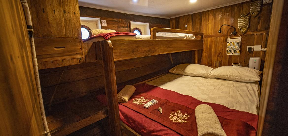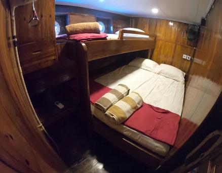 Diese Kabine befindet sich hinter der Kapitänskabine auf der obersten Ebene und ist eines unserer besten Zimmer. Neben dem eigenen Badezimmer und der Stockbettaufstellung liegt sie in der Nähe der Annehmlichkeiten auf dem Oberdeck und erhält viel natürliches Licht.