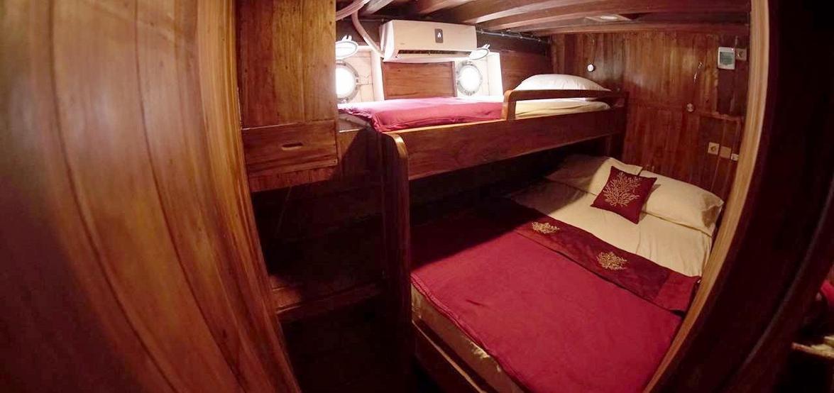 Unsere budgetfreundliche Option: Diese gemütliche Kabine bietet Platz für bis zu 5 Gäste und verfügt über eine eigene Toilette. Sie befindet sich im vorderen Bereich des Boots auf dem Unterdeck – perfekt für eine Freundesgruppe, die sich den Raum teilt und nach einem vollen Surftag noch ein paar Lacher teilt. Trotz des günstigen Preises ist die Kabine komfortabel und mit starker Klimaanlage ausgestattet, damit alle kühl und erholt schlafen können.