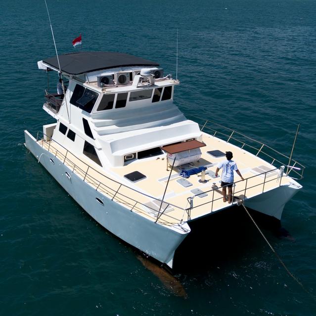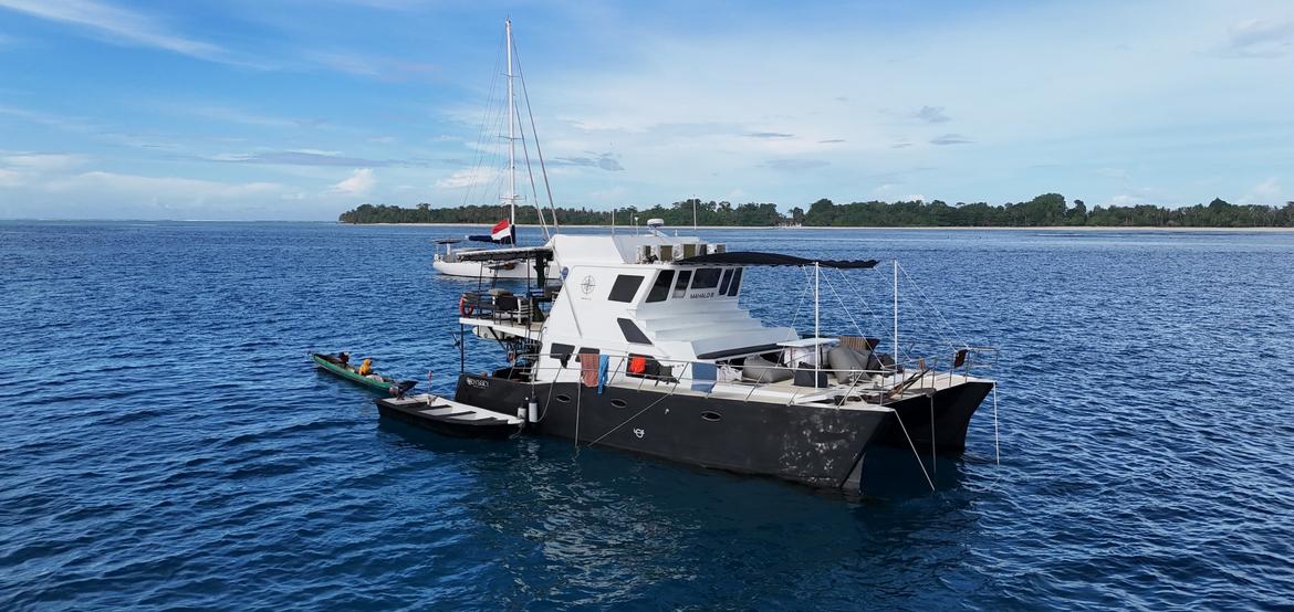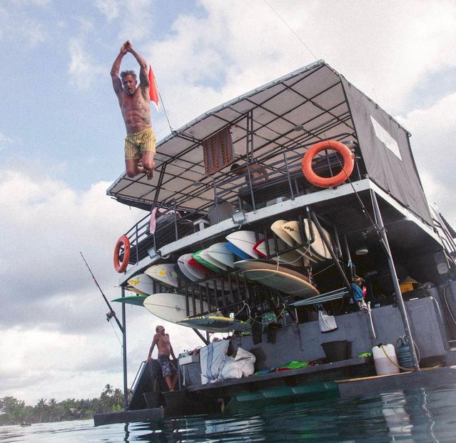 Das Boot erstreckt sich über drei Decks und verfügt über einen Wohnbereich und eine Küche für gemütliche Pausen sowie einen großen Surfboard-Raum mit Plattform auf Meereshöhe, damit die Boards ohne Aufwand direkt ins Beiboot geladen werden können.
