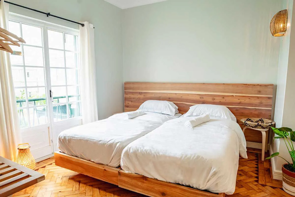 The three cozy triple rooms are located on the ground floor of the bed and breakfast in Lisbon, and share two bathrooms. The rooms are equipped with three single beds, two of which can be joined together to form a double bed. That makes this room at Surf House Lisbon also ideal for couples and surfing buddies!