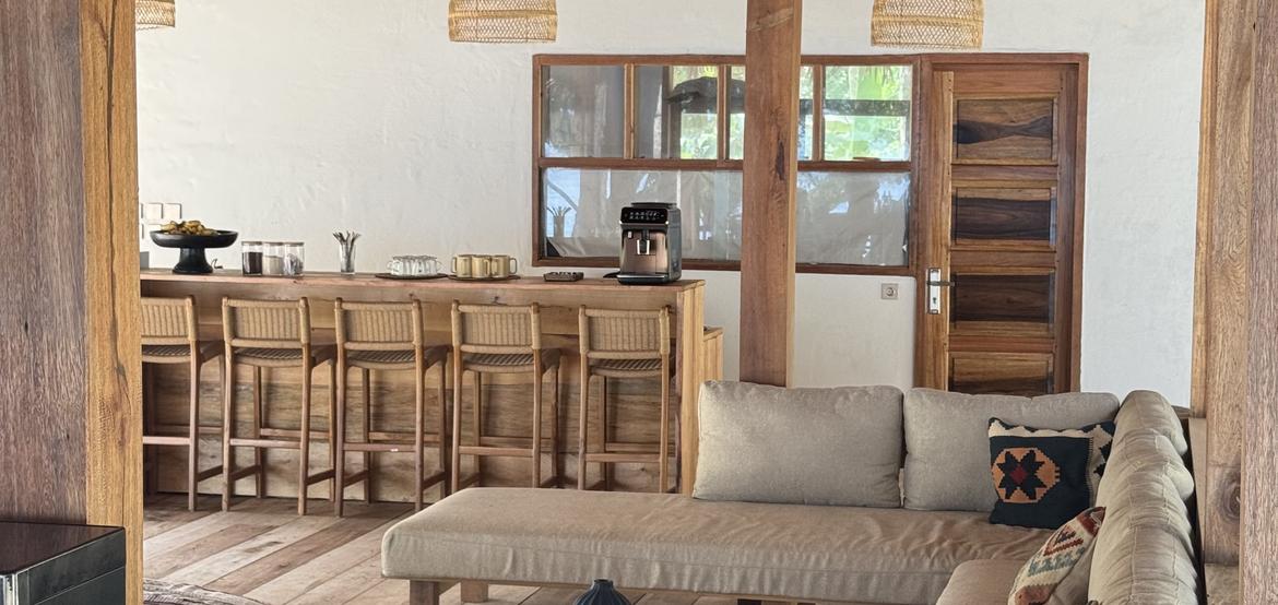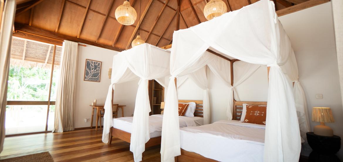 Unsere privaten Bungalows wurden von einem balinesischen Architekten entworfen und verbinden tropische Eleganz mit praktischem Komfort. Jede 40-m²-Einheit bietet eine minimalistische, warme Ästhetik mit natürlichen Materialien, großzügigen Raumvolumen und großen Öffnungen, die Licht und Meeresbrise hineinlassen.