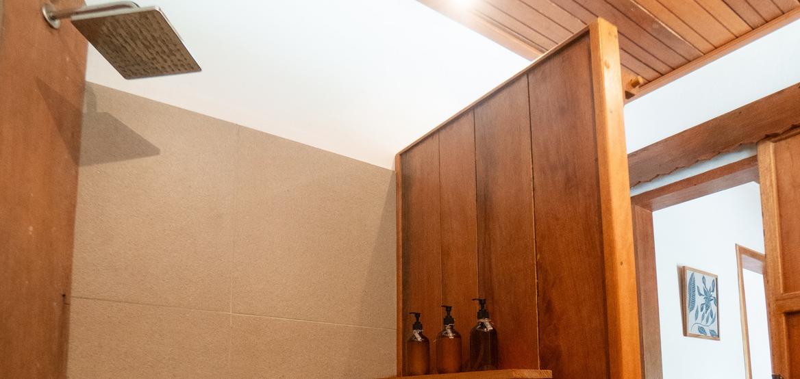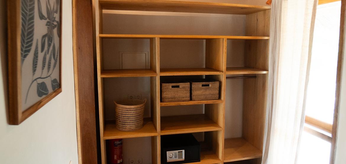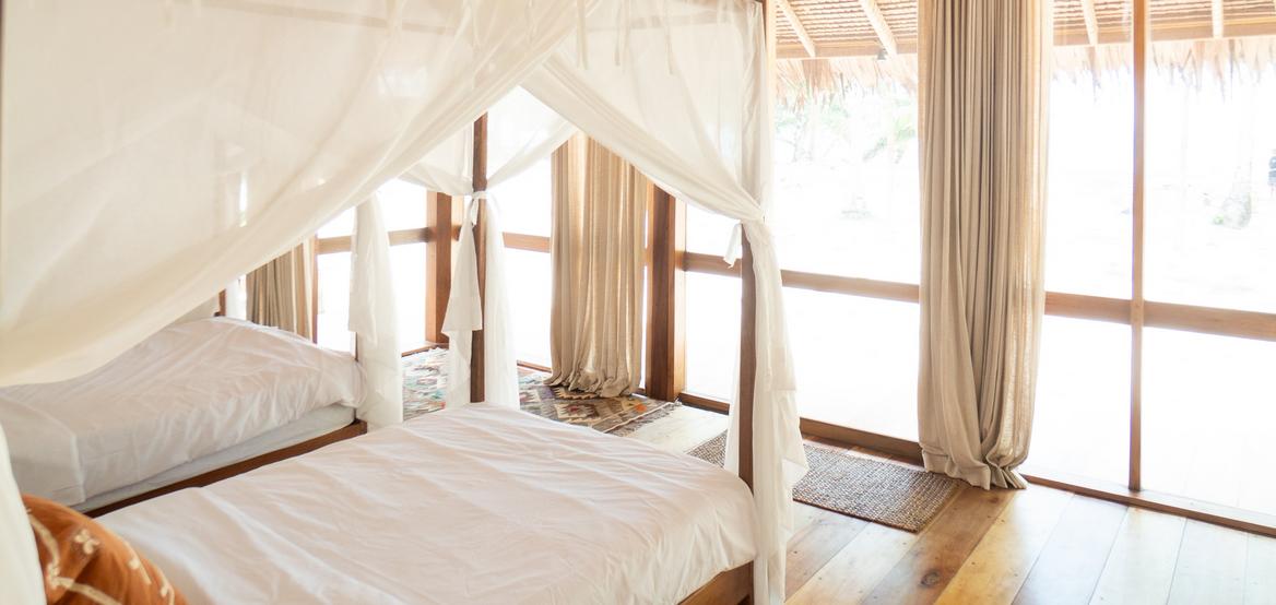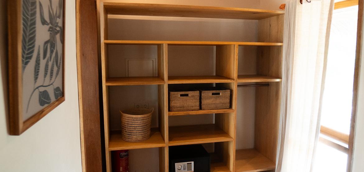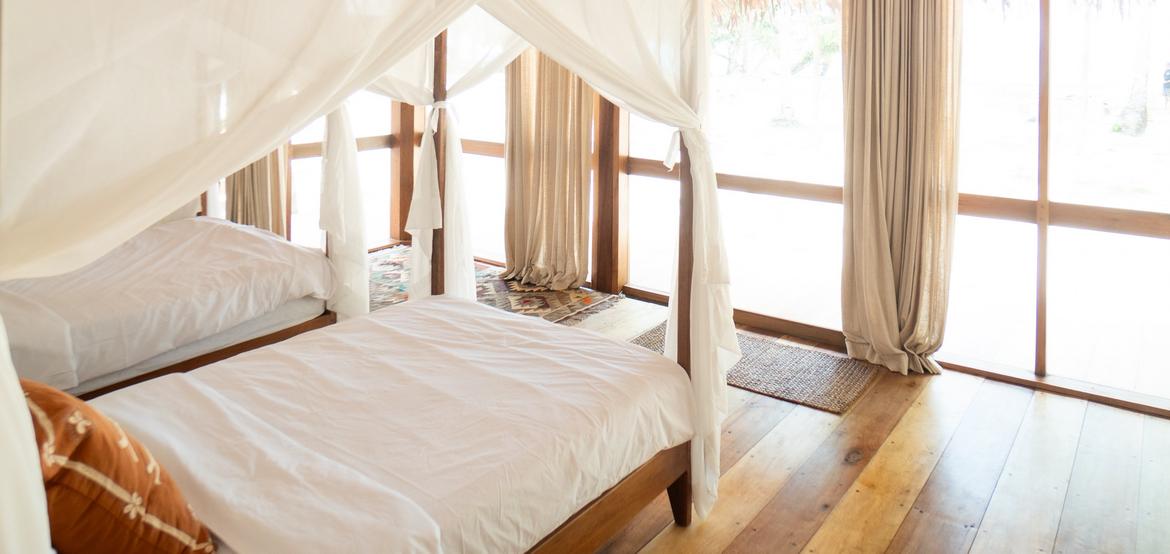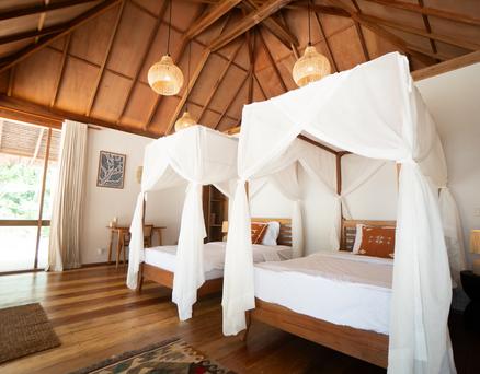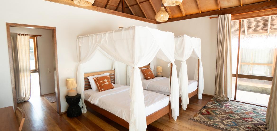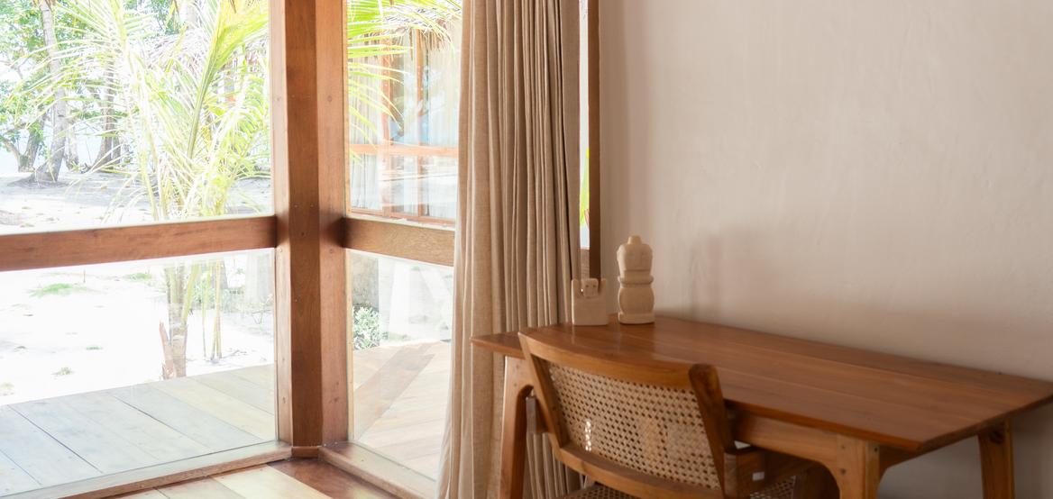 Jeder Bungalow verfügt über eine Klimaanlage, ein Badezimmer mit Warmwasserdusche, einen integrierten Ankleidebereich sowie einen Schreibtisch. Der Wohnraum öffnet sich zu einer umlaufenden Holzterrasse auf drei Seiten, die Privatsphäre, Schatten und einen panoramischen Blick auf den Ozean und den Sonnenuntergang bietet – perfekt zur Entspannung nach einer Surfsession.