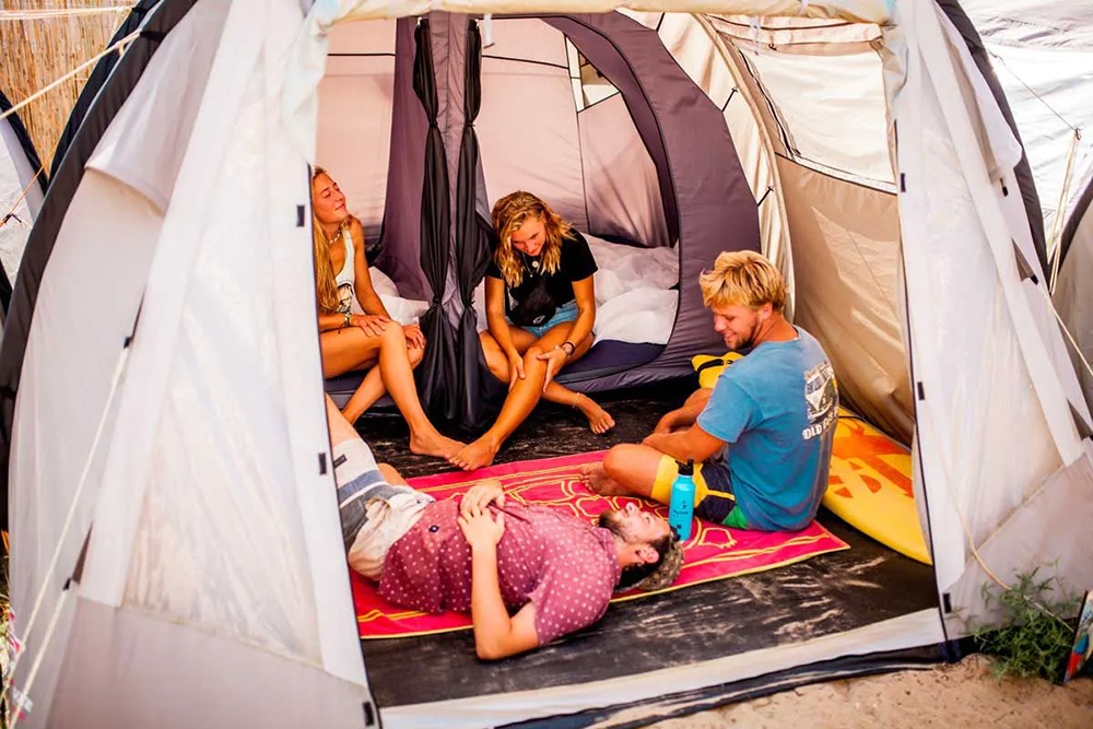 The camp is super cozy and built around the bar, the beating heart of the camp. This is the place for cozy evenings, the start of the activities and of course the best place to chill out between wave surfing.